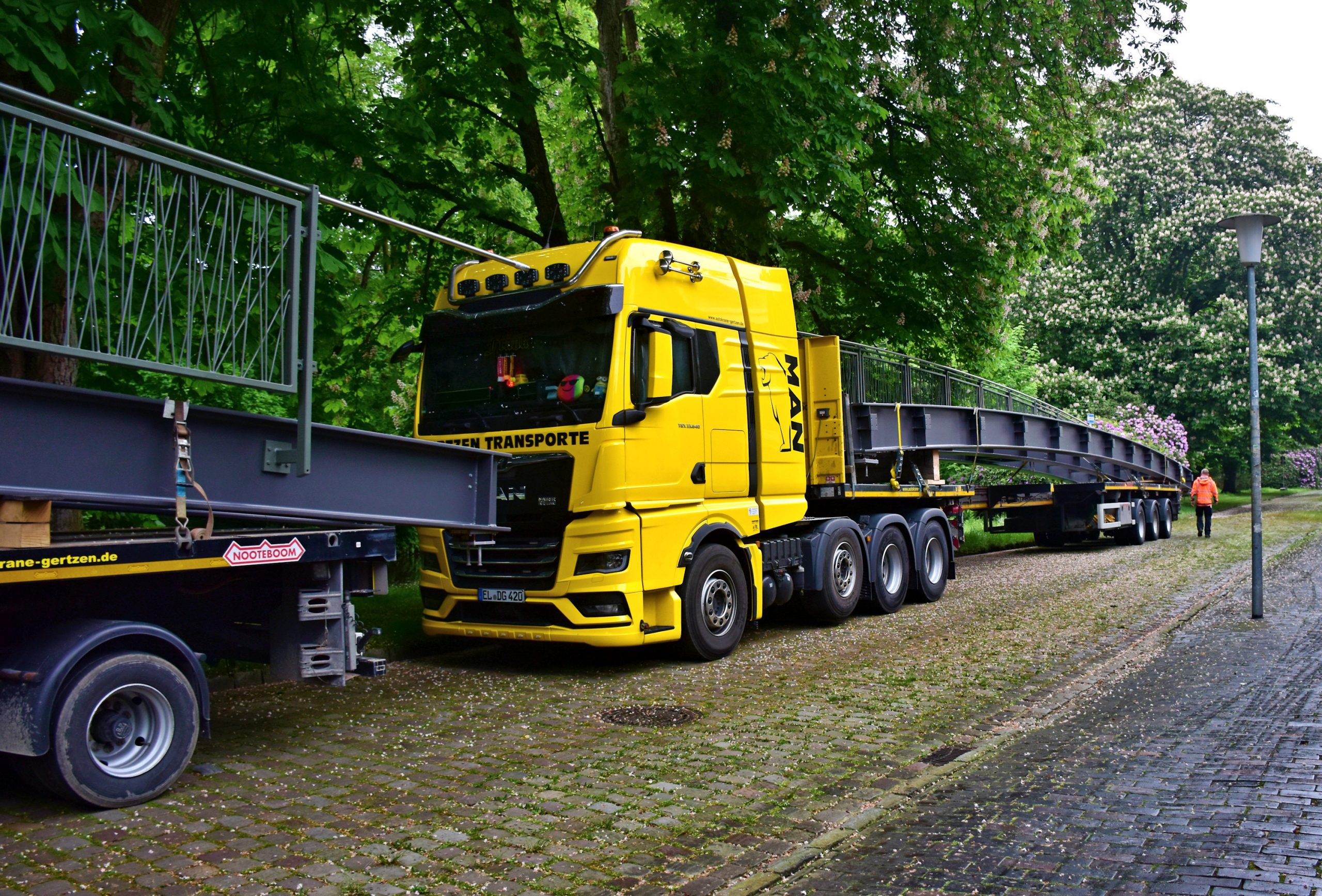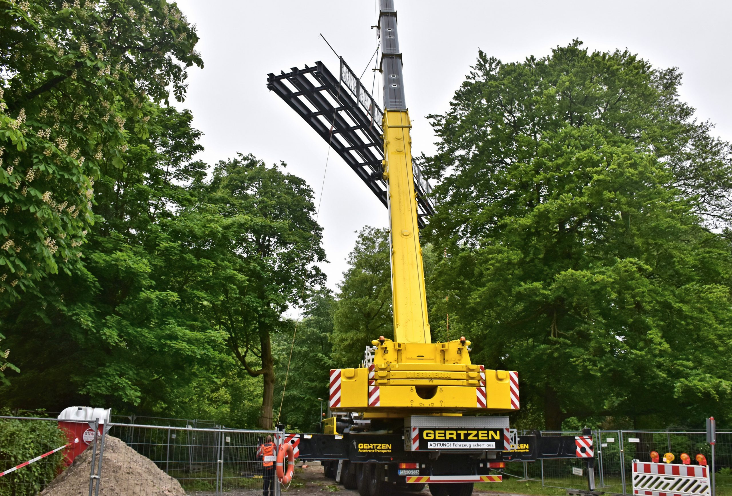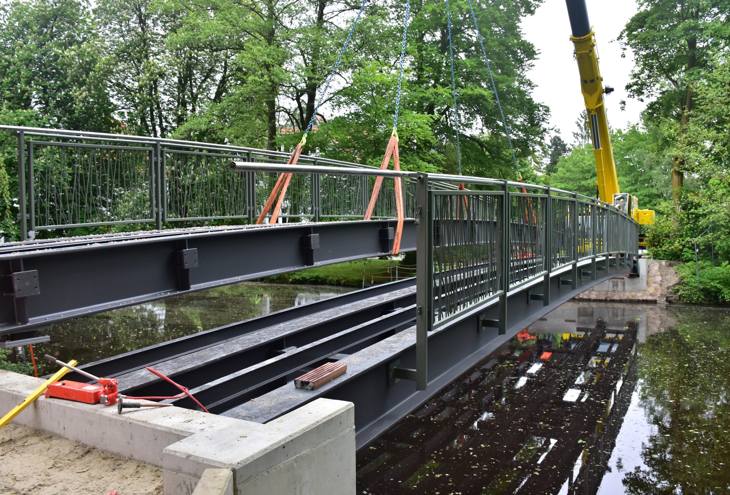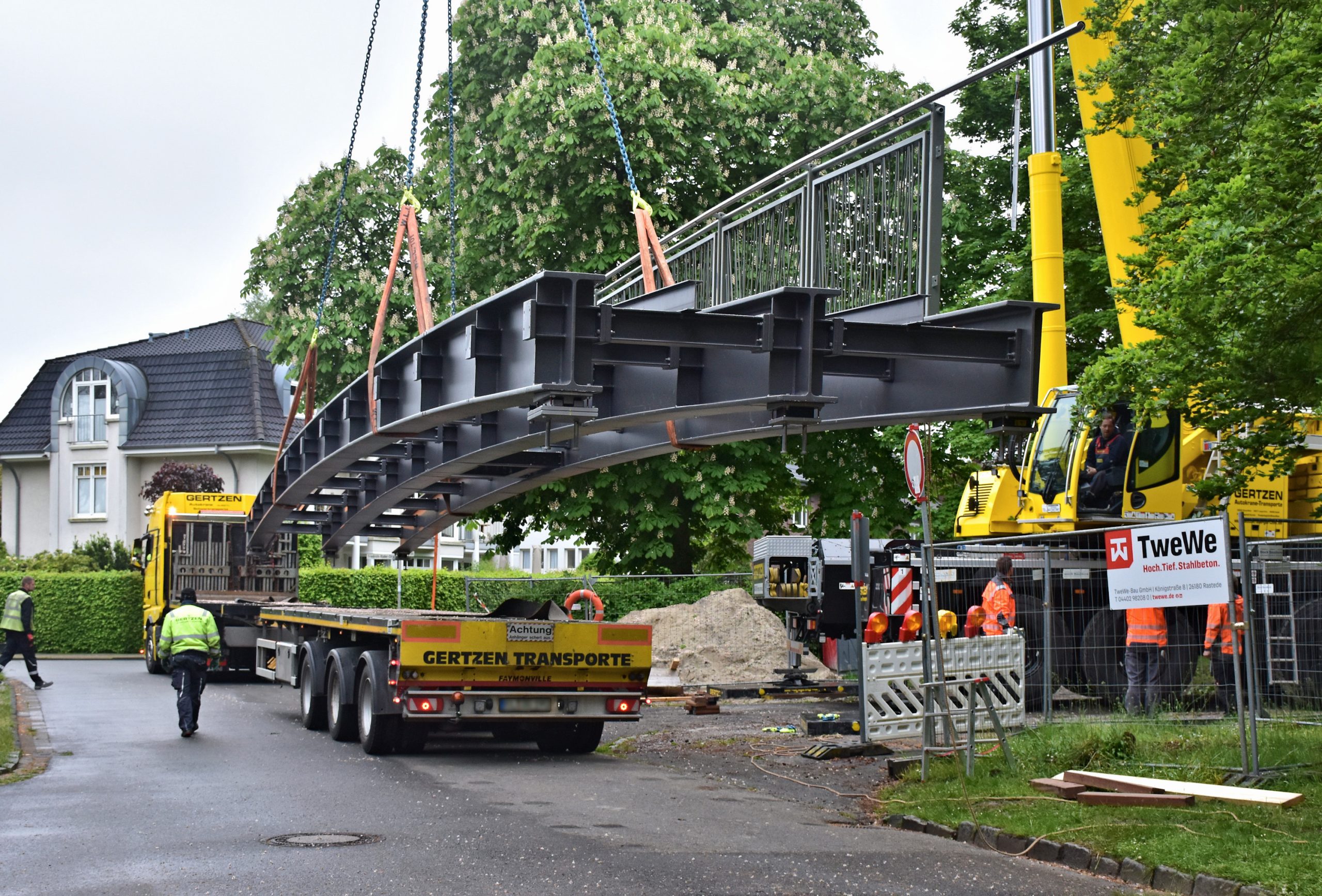 Zwei Schwerlasttransporte lieferten die im Werk der Schmees & Lühn Holz- und Stahlingenieurbau GmbH & Co. KG vorgefertigten Brückenteile nach Oldenburg. Dort wurden sie von einem Mobilkran auf die von unserem Team vorbereiteten Widerlager gehoben.