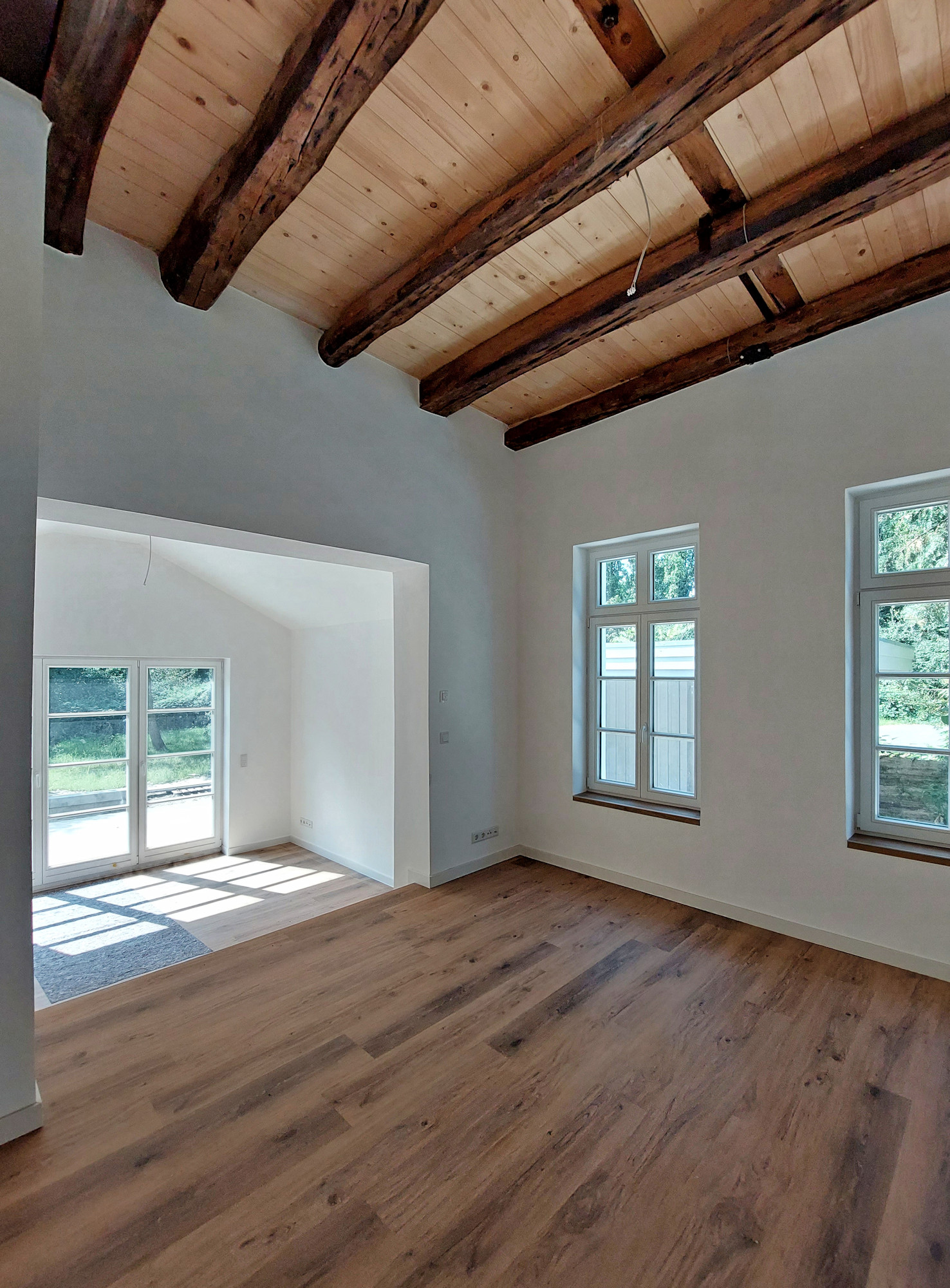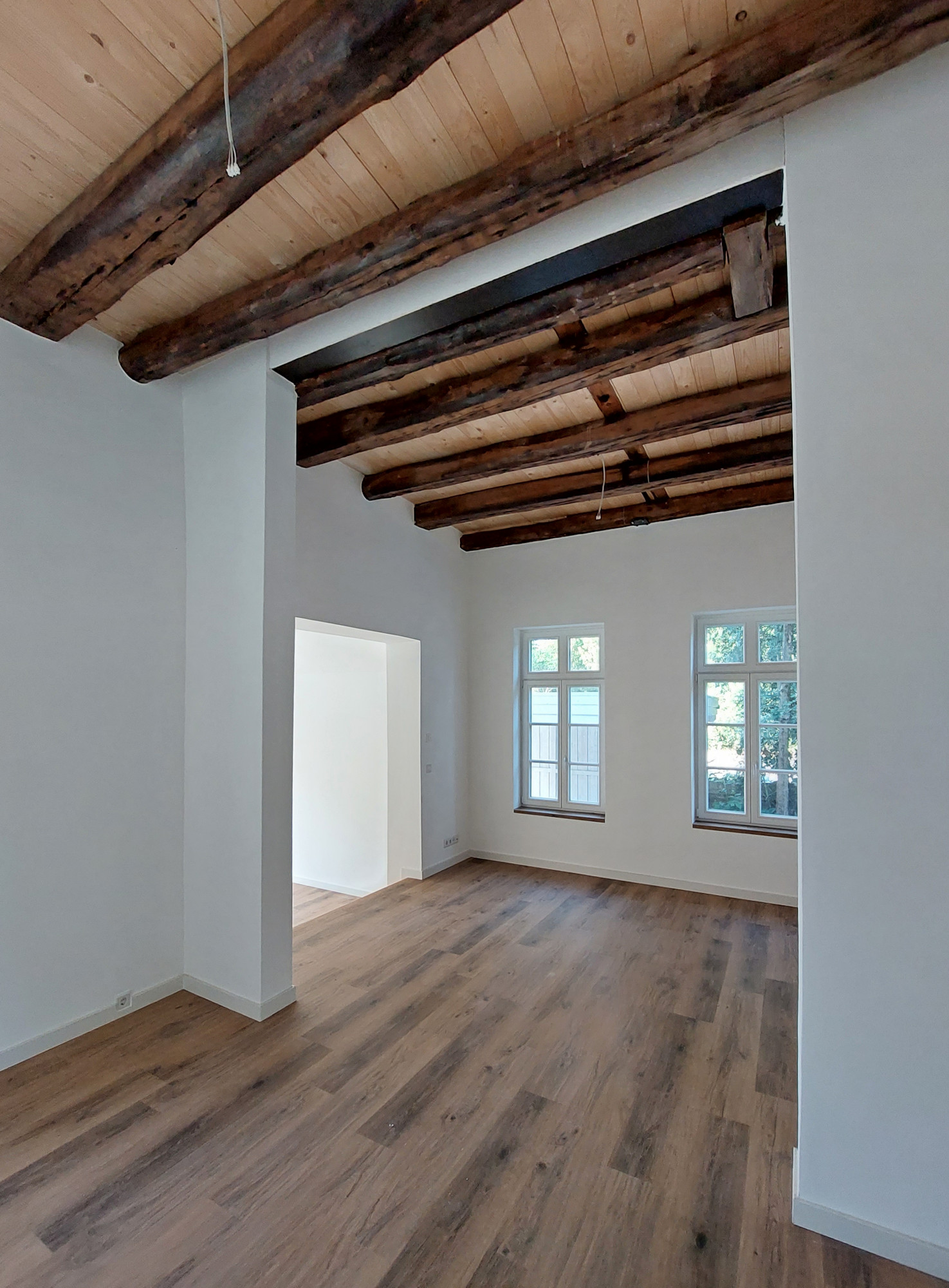 Im Auftrag des aktuellen Eigentümers haben wir das Doppelhaus unter Beibehaltung der prägenden Elemente, insbesondere des äußeren Erscheinungsbildes, instandgesetzt. Dabei wurden soweit möglich auch die alten Mauerpfeiler, die Deckenstützen und die Treppen erhalten.