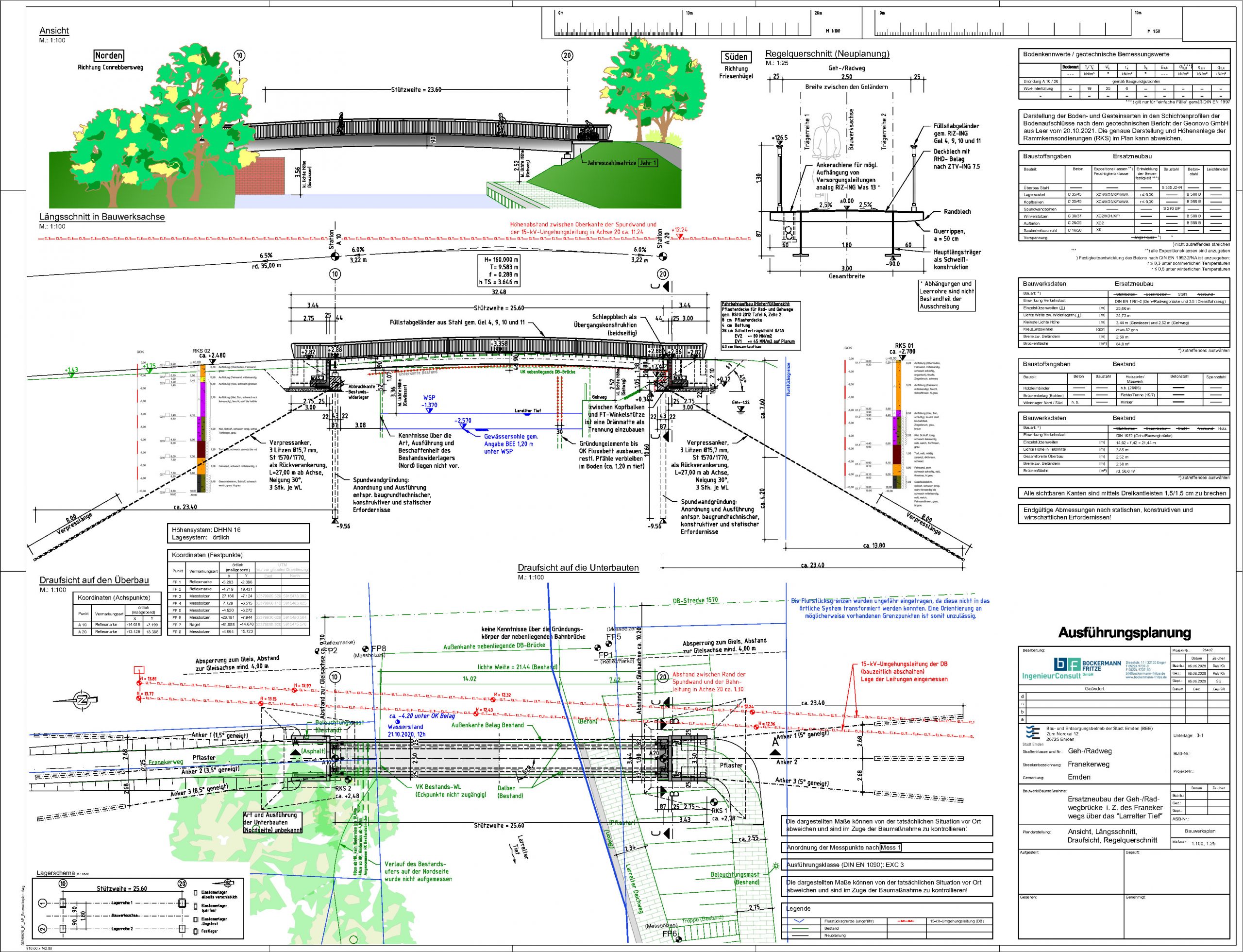 Der Bau- und Entsorgungsbetrieb Emden plant die Erneuerung der Geh- und Radwegbrücke im Zuge des Franekerwegs über das Larrelter Tief. Den Zuschlag für die Ausschreibung konnten wir am 03.09.2025 erfolgreich für uns entscheiden und befinden uns seit dem in der Planungsphase dieses spannenden Projekts.